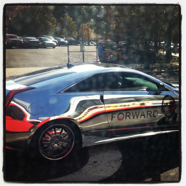 This driver pulled up next to my bus at a light at Union Station on Mass ave. Pedestrians stopped in the middle of the intersection to get photos from all sides of this car. I unfortunately only have the right side, but it’s a Cadillac in all chrome, from top to bottom, including the rims. The side is emblazoned with Obama’s face and campaign slogan, as well as the hashtag, #obamascar. His license plate wasn’t commercial so I’m assuming it isn’t a company car (though it very well might be) and is some VERY dedicated supporter.