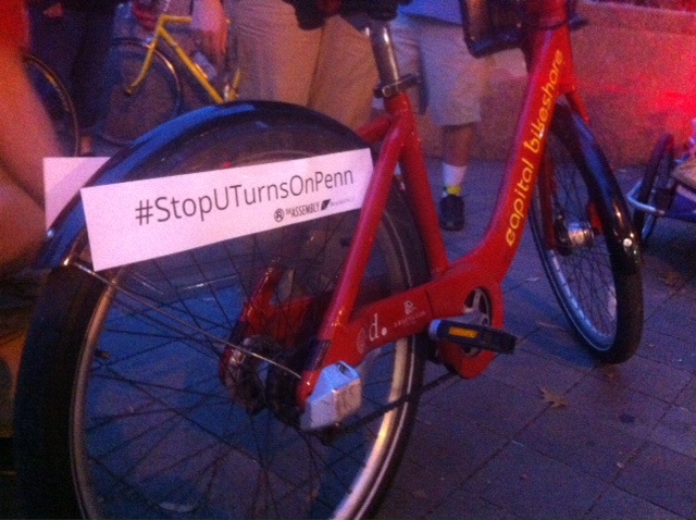 A group of cyclists rolled back and forth along the length of the Pennsylvania Avenue bike lanes this morning, trying to raise awareness among drivers and policymakers of the danger posed by drivers making illegal U-turns through the lanes.