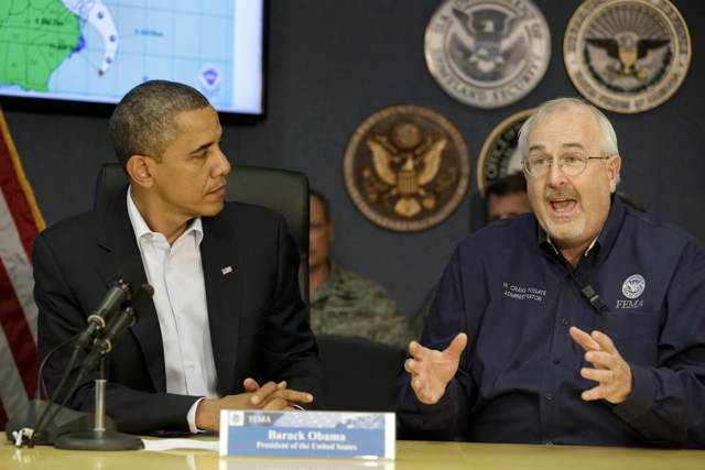 President Obama met with FEMA Administrator Craig Fugate at the agency’s headquarters on Sunday. (AP Photo/Jacquelyn Martin)