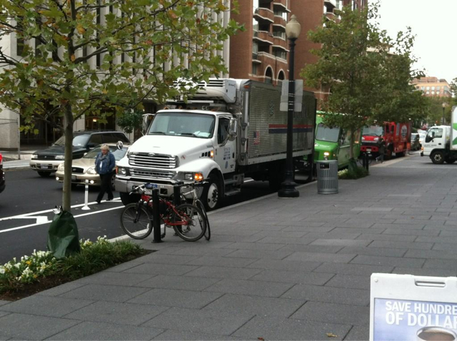 UPDATE: Some readers noticed, wisely, that the vehicles parked in the bike lane in the photo above are commercial trucks. However: