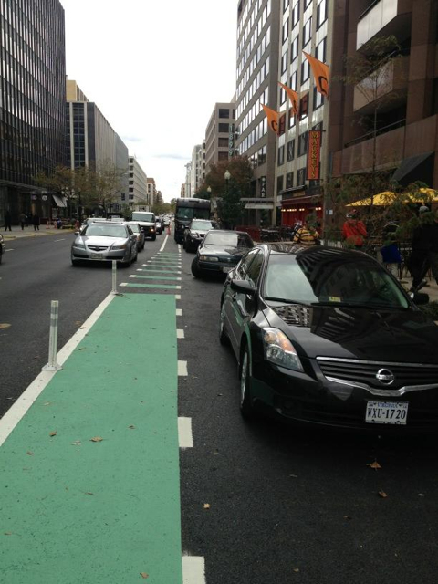 See what’s going on in the picture above? Drivers—greedy, unthinking drivers—are still parking on the left-hand side of L Street NW, even though that part of the road between New Hampshire Avenue and 12th Street is currently getting turned into a bike lane.