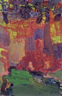 Kirkeby’s canvases are accumulations of paint and gesture that speak to time and its earthly attendants, growth and decay. Scratches, drips, and glops of paint interrupt layer upon layer of brushstrokes. There is order, but there is chaos, as well. Man and nature, light and dark, permanence and the ephemeral coexist in Kirkeby’s paintings, forever locked in tense opposition. Inferno V draws the eyes upward, from a green base of organic matter to a blackening structure consumed by heat. Colors are obscured and revealed as creation and destruction play in the painting. A quote from Kirkeby on a wall reads, “Everything is collapsing and transforming deep inside the picture”.