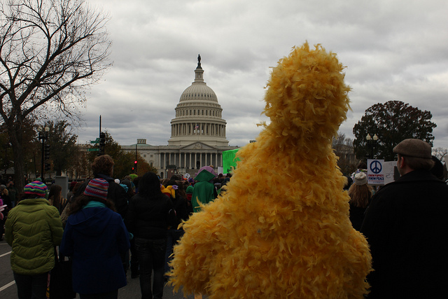 At first it didn’t seem like the guy would show. He had to! It was his job on the line, after all. Only weeks ago Republican presidential contender Mitt Romney said that as much as he liked PBS and Big Bird, public broadcasting—and Big Bird—would lose their federal funding if he won the election. It would only make sense for Big Bird to show up at a protest for his own livelihood, right?