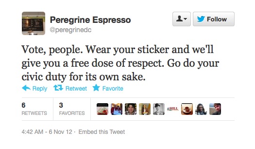 With a number of restaurants offering free food for those who come in with an “I Voted” sticker—which, as we’ve reported, isn’t really legal—Peregrine Espresso might well win the day with this on-point tweet: