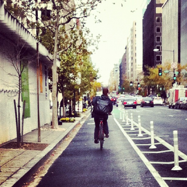 The grainy solitude of the new L Street bike lane, caught by Flickr contributor Joe in DC.