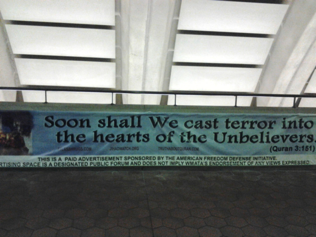 Metro riders spotted more banners at the Glenmont, Petworth-Georgia Avenue and U Street-Cardozo stations featuring a Koran verse accompanied by—yet again—the indelible image of a Boeing 767 crashing into the World Trade Center.