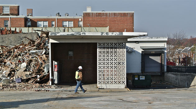 Composition is everything. This demolition shot by dullshick was one of two photos made moments apart. But here the planes of destruction and homes are set up as a journey of progress for the lone worker. (EXIF)