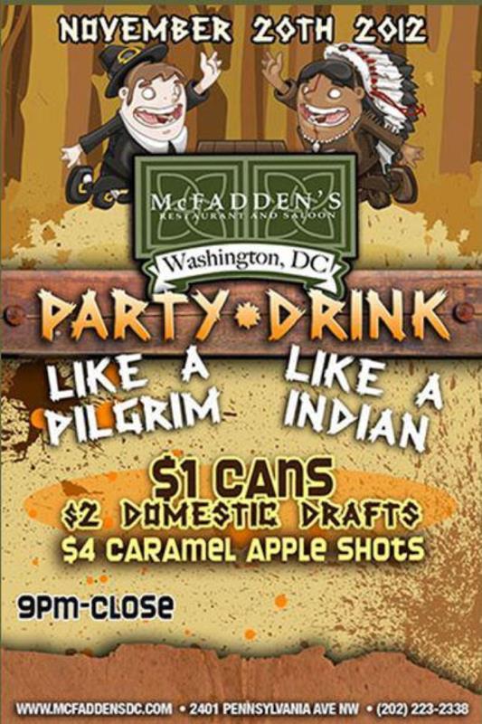 Judging by how it plans to celebrate Thanksgiving, the Foggy Bottom bad-memory hole McFadden’s seems to be doing everything in its ability to cement its reputation as D.C.’s douchiest bar. The bar, launching pad for countless walks of shame back to the George Washington University dorms and vomit-filled cab rides to Glover Park, figured it would mark the season by inviting patrons to “party like a pilgrim” and “drink like a Indian”: