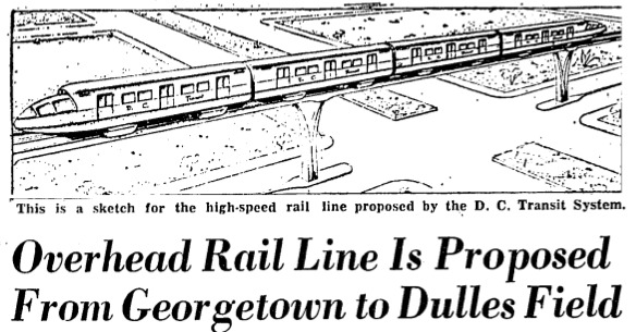 Additionally, construction of Metro’s Silver Line is proceeding, with service to Dulles expected in the next few years. If you think that rail service to the distant suburban airport is overdue, you’re not alone—even the planners behind Dulles’ construction advocated for a fast train to the airport, and they pushed for it even before the airport, and Metro, was fully built. (The proposed train would have gone 85 miles an hour!) Check out the Post headline from February 1, 1962: