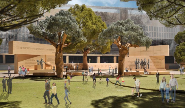 Gehry envisions a large square with a statue, walls bearing inscriptions of Eisenhower’s sayings and 80-foot-tall metal tapestries with images of the Kansas landscape framing the site. The design and construction of Gehry’s design is estimated at $142 million.