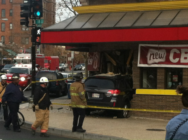 A driver who crashed a Subaru Outback into the McDonald’s restaurant at 2481 18th Street NW this afternoon may have suffered a medical emergency. The crash prompted authorities to shut down the busy intersection with Columbia Road in the heart of Adams Morgan.