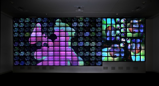 In their place comes Megatron/Matrix (1995), an eight-channel video installation the size of a billboard that pointed the way to all the giant-screen, super-jumbo, mega-multiple screen action and distraction we take for granted in the 21st century. Megatron/Matrix, whose title refers to both the vast reach of the media and its impact on each individual presents a non-stop assault of images that spiral and flow in a riot of color and sound. Paik, who coined the term, “The electronic super highway,” saw both the helpful and harmful aspects of technology. He predicted that television, and by extension the Internet, would help dissolve boundaries in the electronic age. But he also warned against allowing commercial interests to dictate how the medium was used.