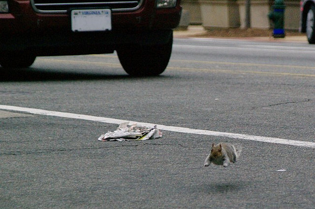 We feature a lot of nature shots in this “Photo of the Day” series, but mostly of the still-life, gazing-at-an-open-field variety. Not so in this action shot captured yesterday by the seemingly ever-present philliefan99. Oncoming car? NBD, says this squirrel, who leaps heroically to avoid being turned into bloody mush outside the National Archives. (EXIF)