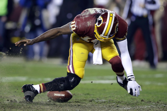 Robert Griffin III twists his injured knee on a bad snap in the second quarter of the ‘Skins game yesterday against the Seattle Seahawks. (AP Photo/Matt Slocum)