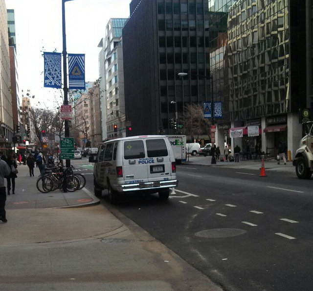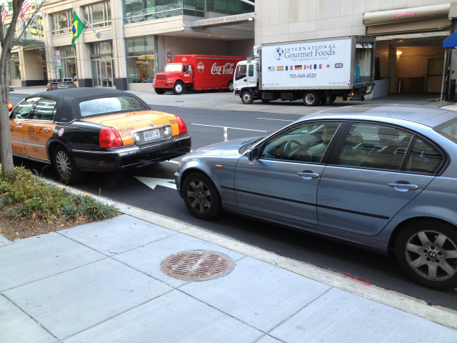 Thankfully, there’s now a Tumblr blog devoted to shaming such drivers. Jay Corbalis, a DCist reader, shares with us a growing collection of cars, taxis and vans that are blocking bike access. Yes, some of the vehicles are on the outer edge of L Street’s new mixing zones that approach intersections, but most are parked inside the bollard-protected area that is supposed to be for the bikes. By the way, blocking a bike lane with your car carries a fine of $65.