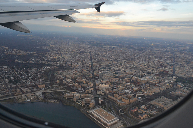 Flickr contributor daimoneklund gets a magnificent aerial shot of D.C. from an airplane window; New Hampshire Avenue seems to disappear into the horizon from its starting point at the Kennedy Center.
