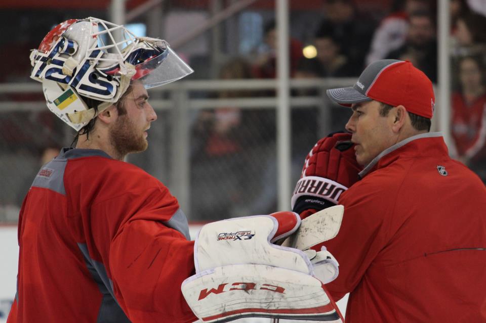 Caps goalie Braden Holtby talks with head coach Adam Oates at Sundays training Session. Photo courtesy of the Washington Capitals.