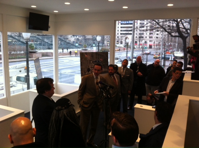 And today, Mayor Vince Gray and other officials and voting rights advocates showed off the reviewing stand from which local leaders will watch next Monday’s inaugural parade. And the cost of constructing the hastily, but sturdily built structure, made from drywall, plexiglass and wired for heating and electricity (including a pair of flat-screen televisions)? About $342,000, though Gray spokesman Pedro Ribeiro said that sum will eventually be reimbursed by either the federal government or Presidential Inaugural Committee. Ribeiro added that even though the stand will have a short life span, it still needed to meet the Department of Regulatory and Consumer Affairs’ building regulations.