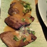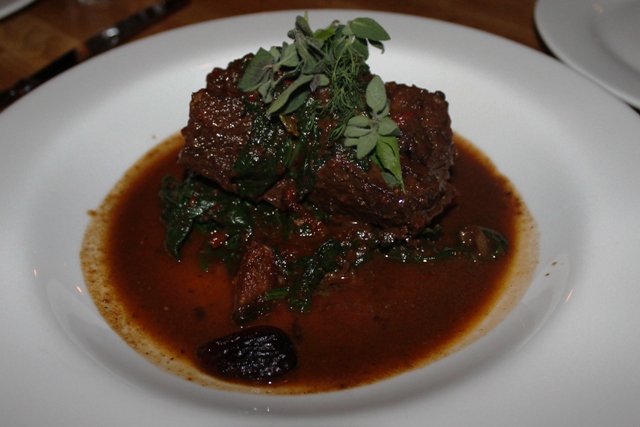 Flanken is both the name of a certain way to cut short ribs—across the bone so that you several ovals of cross-cut bone attached by the rib meat. In Korean cooking, the cut is marinated for the grill and known as kalbi. In Ashkenazi Jewish cooking, the cut is potted and braised. At DGS, Koslow is putting his own spin on Jewish and deli classics. His flanken, stewed with figs and Tunisian spices, is served on bed of spinach and sauced with braising juice slightly sweet from the figs and a bed of spinach. Just as the pot roast/short rib at Firefly, no knife is required. And just as at Firefly, you won’t find meat falling off the bone. Though the cut suggests otherwise, there is no bone. The meat is meltingly tender.