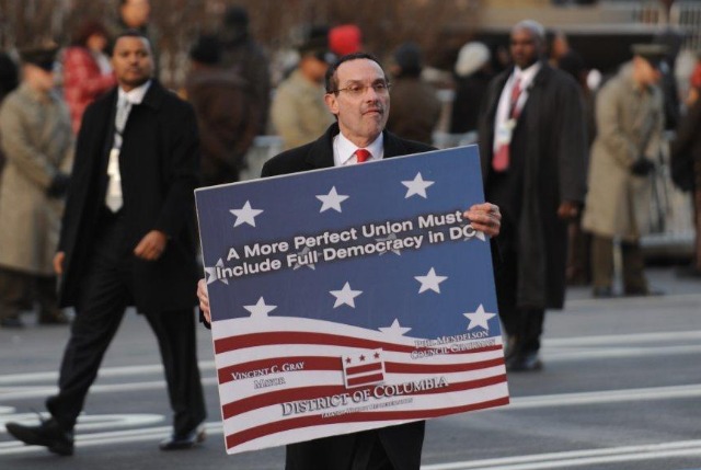 Mayor Vince Gray took the opportunity afforded to him as a participant in the inaugural parade to again make a statement about D.C.’s lack of voting rights.