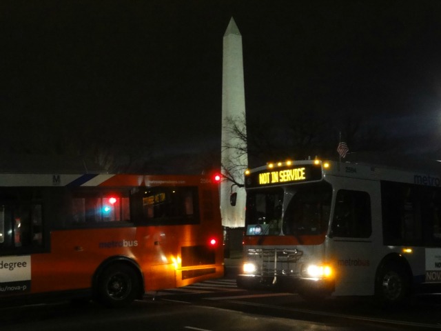 On the way down to the inauguration this morning, I noticed an interesting re-purposing of Metrobuses: they’re being used as security measures along roads leading east towards the National Mall. The two buses pictured above blocked Constitution Avenue at 17th Street NW, and buses similarly blocked east-west roads along 19th Street NW.