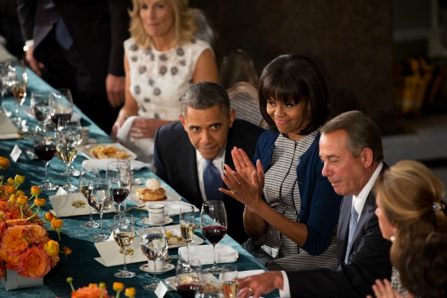 U.S. President Barack Obama shares a moment with House Speaker John Boehner as first lady Michelle Obama applauds at the Inaugural Luncheon in Statuary Hall on inauguration day at the U.S. Capitol building January 21, 2013 in Washington D.C. President Obama was ceremonially sworn in for his second term today. (Photo by Allison Shelley/Getty Images)