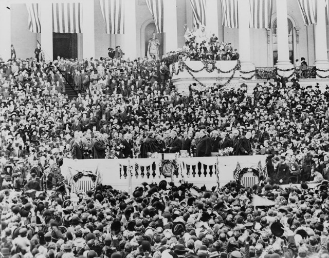 Third, things were a little less strictly controlled and secured. At one point, the Post described Pennsylvania Avenue as being a “riot of noise and enthusiasm” and said that “thousands gayly paraded the electrically emblazoned street” the night before the inauguration. Still, there wasn’t a whole lot of official celebrating: Wilson suspended the official inaugural ball (the first time such a move had been made since 1853), saying that he felt it was inappropriate for the solemn occasion.