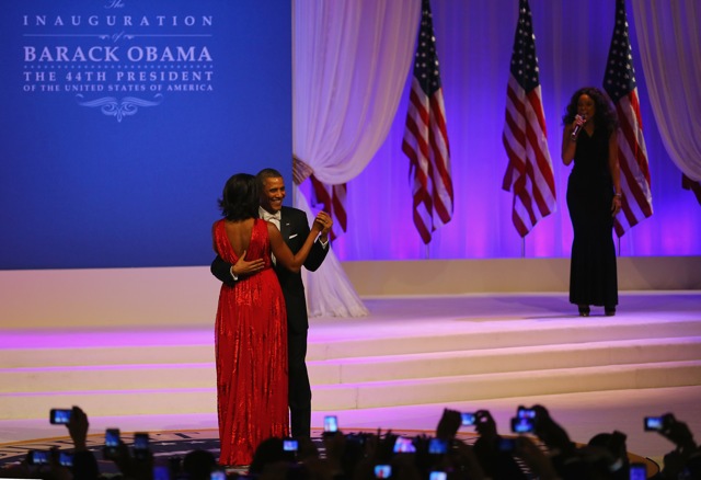 Jennifer Hudson, the Grammy- and Oscar-winning singer and actress serenaded the first couple with a cover of Al Green “Let’s Stay Together.” Four years ago, it was Beyoncé who sang Etta James’ “At Last” to introduce the president and first lady to the party circuit. The couple danced closely, then waved to the crowd for a few seconds before departing the stage.