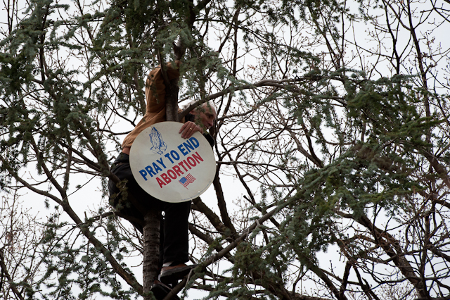 A 47-year-old pro-life protester who climbed a tree during Monday’s inaugural festivities and tried to shout down President Obama has been banned from D.C., reports the Post.