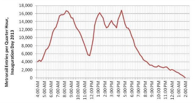 After the swearing-in was completed, the pattern switched, with the stations closest to the National Mall seeing very heavy use. Gallery Place led with 53,077 entrances, followed by L’Enfant Plaza (36,628), Metro Center (34,125), Union Station (31,574), and Farragut West (22,618). All told, Metro reports that the top 10 busiest stations near the mall saw 10 times their usual ridership that day.