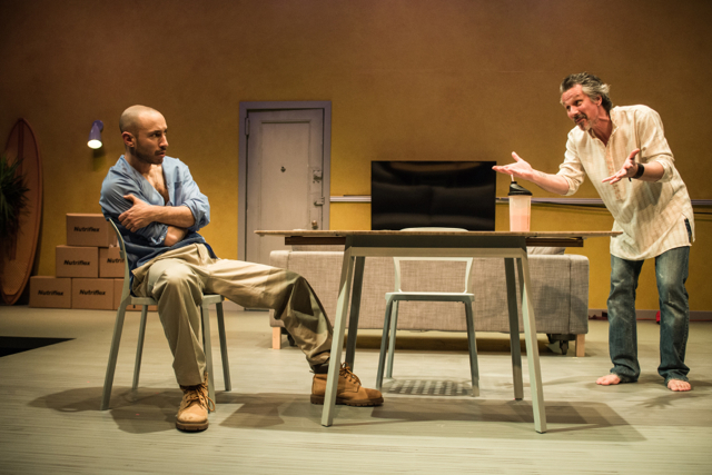 Guirgi’s writing is moved along nicely by each element in this show, especially by Eric Shimelonis’s urgent music and sound design, Michael Giannitti’s lighting, and Debra Booth’s stage design.