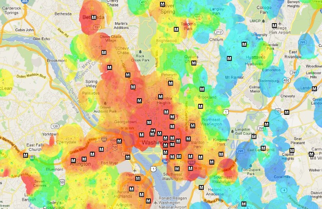 The folks over at We Love D.C. have created a map that indicates how expensive an area is by shading—red areas indicate higher rents (hot!), while green and blue give away the few remaining affordable places in the region. In those red areas, you can expect one-bedroom places to go for up to or more than $1,800, while in green areas you’d be in the $1,000 range and in blue you’d be below that.