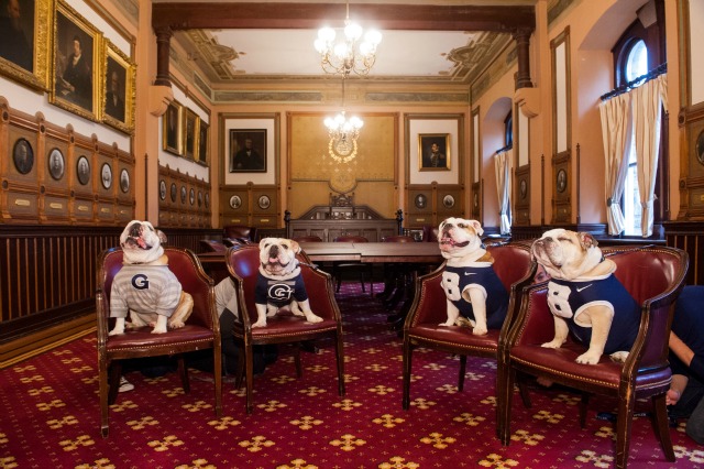Today Butler University’s bulldogs Blue II and Blue III visited Georgetown University, where they met (and likely sniffed the butts of) the Hoya mascots, Jack and Jack Jr. USA Today was on hand to witness the visit: