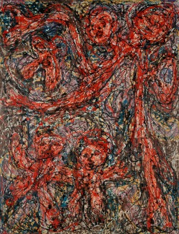 To understand Ossorio’s own style of painting, it is helpful to see his work in the context of Pollock and Dubuffet, both of whom he clearly admired. One of the works on view is Red Family, an Ossorio painting from 1951. Emerging and receding amongst the skeins of paint, red figures float into and out of view, gently testing the boundaries of the canvas. Two small, child-like figures stand near the bottom, while two ghostlike parental figures and angel appear to be drifting away above them. Both bright and sad, Red Family speaks to issues of familial love and loss.
