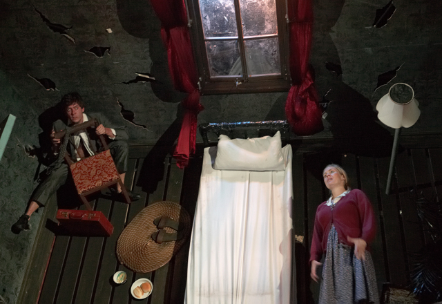 It’s a cubist painting of a room, around which Garðarsson, a founding member of Vesturport and co-adaptor of the material, moves as if he’s not subject to gravity.