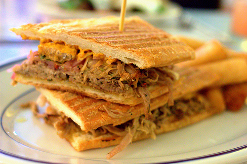 If you’re going to build a sandwich around only one ingredient, that ingredient needs to be very, very good. In the case of pan con lechon, it’s all about the pig. There’s no lettuce, mayo, or mustard here: pan con lechon is just a big ol’ pile of pork between two crusty slices of bread. There are a few grilled onions thrown in for a hit of earthly sweetness and maybe some mojo sauce for a bit of kick, but these are mere after thoughts compared to the sublime pork. Slow roasted in a marinade of sour orange, oregano, and lots of garlic, the pork becomes sweet, garlicky, and meltingly tender. It may not look like much, but the flavors more than make up for the sandwich’s homely appearance.
