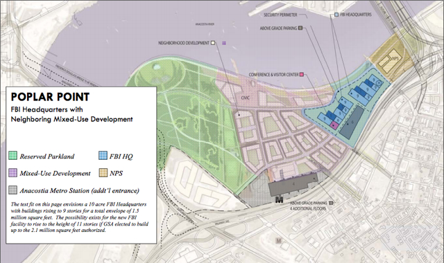 Much of Poplar Point is already spoken for, too. Of 110 total acres, 70 are reserved as parkland, leaving just 40 to be split between the FBI and a private, mixed-use development. Ten acres is about as small as it can get for a massive federal government headquarters that would feature a heavy security perimeter, and the city has expressed far more enthusiasm in seeing Poplar Point used for residential and commercial development.