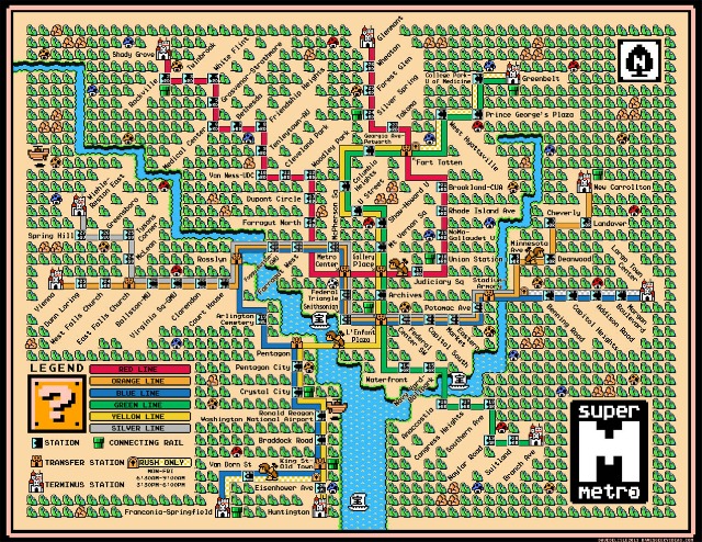 Super Mario Bros. 3 is maybe the last awesome video game I remember playing, so seeing Dave Delisle’s brilliant mix of the Metro system map and the Level 1 map from the classic Nintendo game is an especially great way to end the day. (He did San Francisco before us.) It can even be yours here.