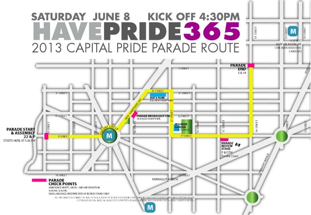 The parade will start at P and 22nd Streets and proceed around Dupont Circle and along New Hampshire Avenue and 17th Street as usual, but once it passes the Whole Foods on P Street it will turn left, instead of right, and head north up 14th Street. The parade will officially end on S Street, but 14th Street will be closed up to U Street.