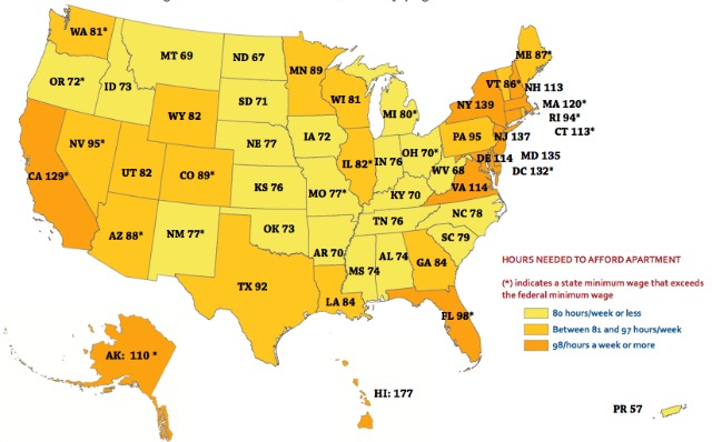 A map showing the number of hours a minimum wage worker would have to toil per week to be able to afford the rent on a two-bedroom apartment.