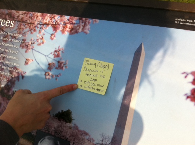 Last year someone was concerned enough that they left multiple post-it notes around the Tidal Basin telling visitors that taking cherry blossoms as souvenirs is not OK.