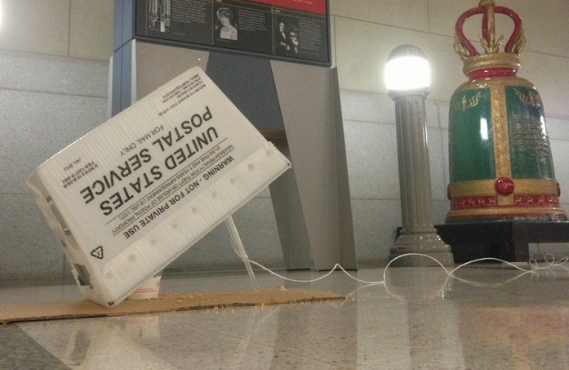 Staff at the Wilson Building are using this humane trap to try and catch two birds stuck in the atrium. Photo by ranpuba
