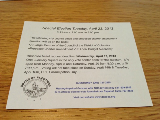 In a postcard send to all registered voters this week, the D.C. Board of Elections mistakenly says that voting will only take place in one location—a voting center at the D.C. government building. “One Judiciary Square is the only vote center open for this election,” read the postcard. “It is open from Monday, April 8 until Saturday, April 20 from 8:30 a.m. until 7:00 p.m.”