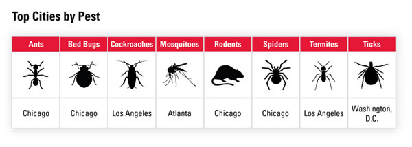 For D.C., we’re apparently prone to ticks more than anything else. Chicago, on the other hand, is a magnet for rodents, spiders, bed bugs and ants; Los Angeles has to contend with cockroaches and termites; and Atlanta has plenty of mosquitoes. The other cities on the list include Miami, New York, Detroit, Houston, Raleigh/Durham, and Dallas-Ft. Worth.