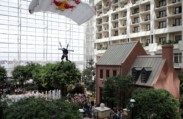 OXON HILL, Md. — Red Bull paid a man to jump from the top floor of the 19-story Gaylord National Hotel and Convention Center and parachute through its atrium. Why? Promoting its annual Flugtag air show later this year, for which this resort complex off Interstate 295 will be one of the host cities.