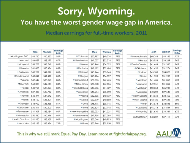 Bottom of the list? Wyoming, a state that has a smaller population than the District, and where women make just 67 cents for every dollar earned by men.