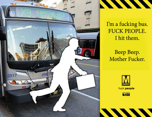 Metro will soon be rolling out a series of safety-related billboards and posters featuring silhouetted human figures on the verge of getting pasted by oncoming buses, slippery platforms, and other transit hazards. The ads are a bit scary, though not quite as nightmarish as the Street Smart campaign that features a cyclist with a giant tire tread over her face.