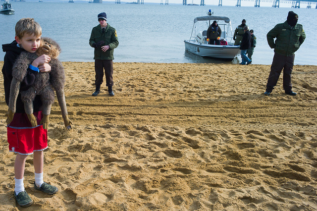 The photographer csuspect may know what is actuallyhappening here, but it looks like this little boy and his monkey are about to be hauled away from the beach.