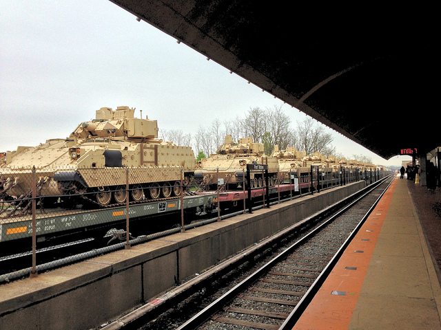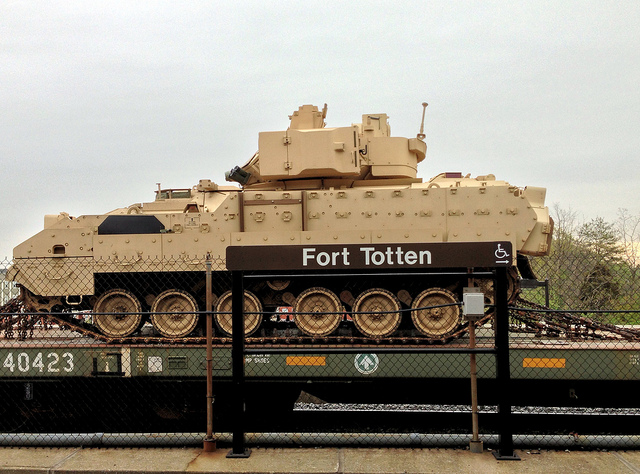 We’re used to seeing plenty of things here in D.C., but a train-load of Bradley Fighting Vehicles sitting by the Fort Totten Metro station on a Tuesday morning might be new to plenty of people. And, it seems, they are—we’ve gotten a few questions from readers as to what these vehicles were doing in D.C.