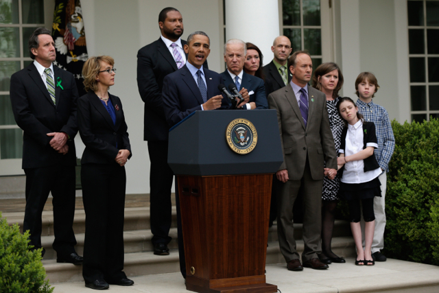President Obama, joined by former Rep. Gabrielle Giffords, Vice President Joe Biden, and families of gun violence victims. (Getty Images)